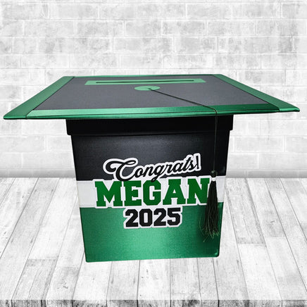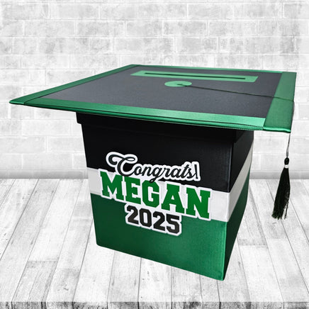 Black, forest green, and white graduation cap style foldable card box with a tassel. Box is great for cards up to 5"x7", money, notes, and other well wishes. The top is made from chipboard and paper and can be used as a guest signing "sheet". Please consider the size of this box and the needs of your party. To avoid mistakes and misunderstandings, please read listing carefully. If something is not clear, please contact me with any questions.