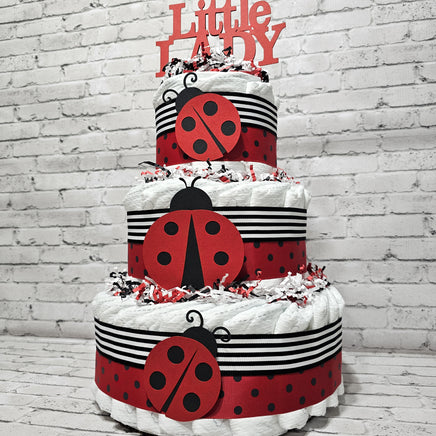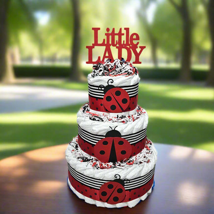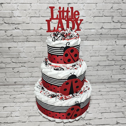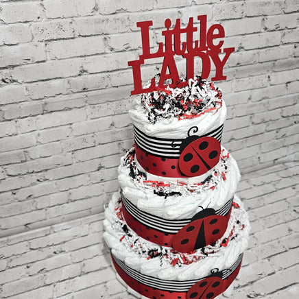 Ladybug diaper cake centerpiece for a girl baby shower. This diaper cake is 3-tier and includes 50 size 1 diapers. The color scheme is red, black, and white. There are 3 paper ladybug cutouts down the front center and it is topped with a "Little Lady" sign.