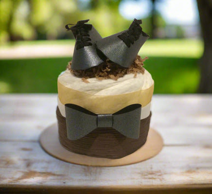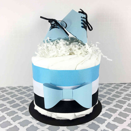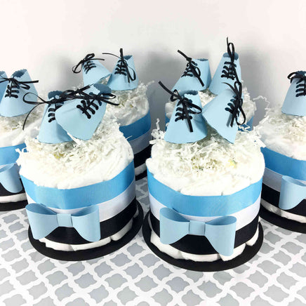 Cute bow-ties and dress shoes themed mini diaper cake centerpiece for your boy baby shower. Comes with 40 (10 in each) diapers and accented with a paper bow tie and dress shoes to sit on the top.