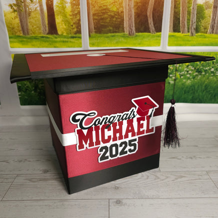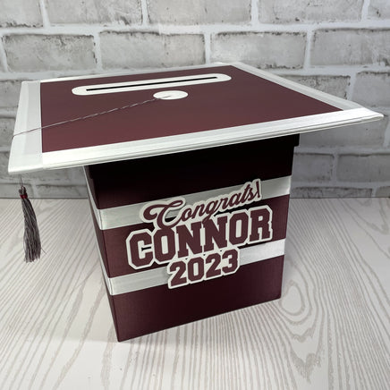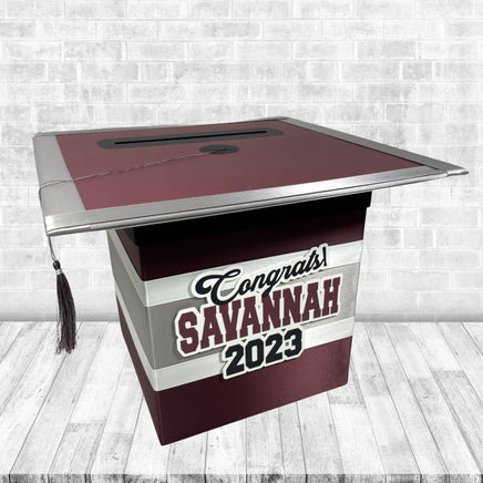Graduation card box with burgundy as the prominent color. Many other color combinations available to match your party.