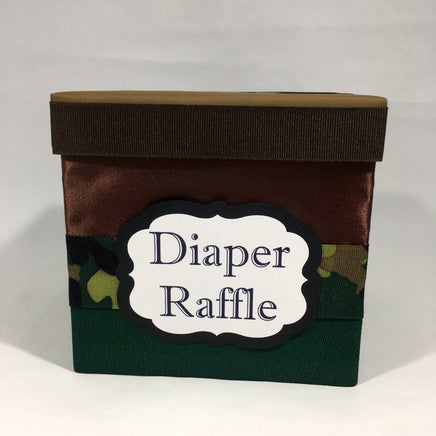 Green, brown, and black camouflage themed diaper raffle ticket box for a baby shower.