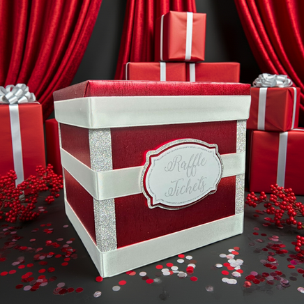 Red, white, and silver raffle ticket box to match your party decorations. Box can be used for a Christmas holiday party, baby shower, or any event.