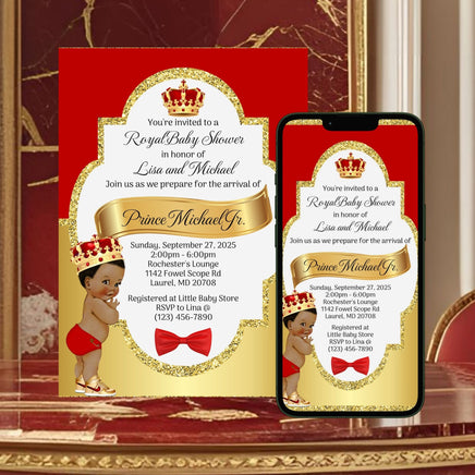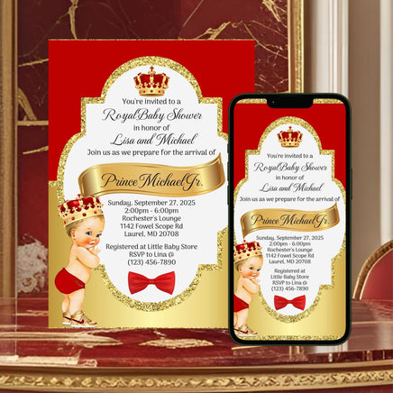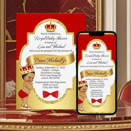 Self editable red and gold digital and printable little prince baby shower invitation set.