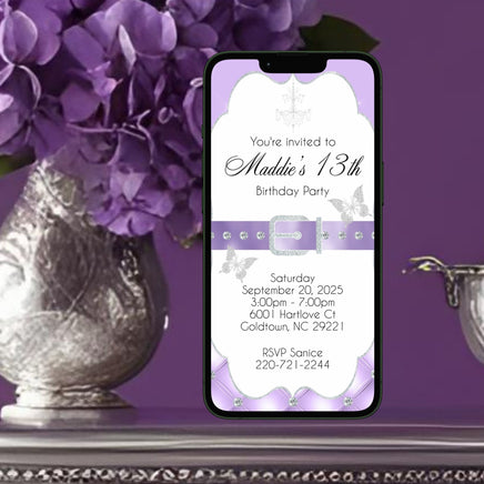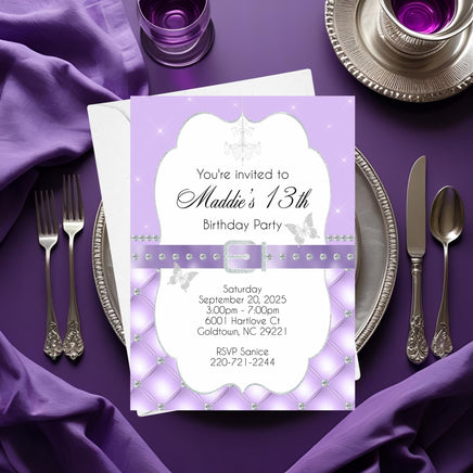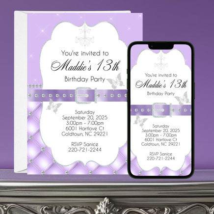 Self editable lavender and silver butterfly and diamonds themed printable birthday party invite for a girl.
