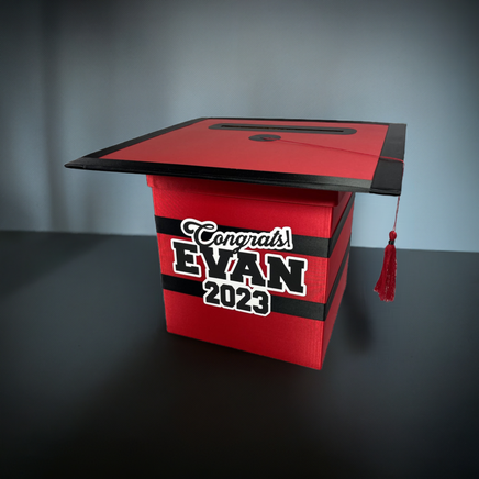 Red and black graduation cap style foldable card box with a tassel. Box is great for cards up to 5"x7", money, notes, and other well wishes. The top is made from chipboard and paper and can be used as a guest signing "sheet". Please consider the size of this box and the needs of your party. To avoid mistakes and misunderstandings, please read listing carefully. If something is not clear, please contact me with any questions.
