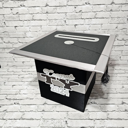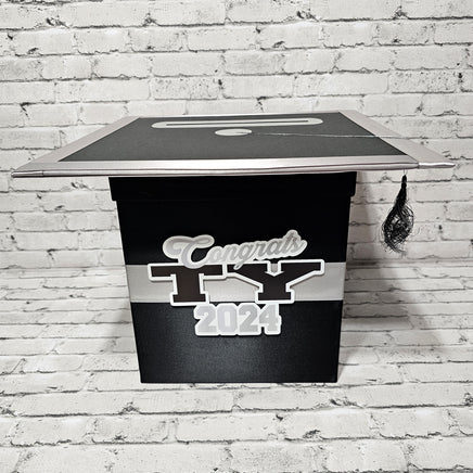 Black and silver graduation cap style foldable card box with a tassel. Box is great for cards up to 5"x7", money, notes, and other well wishes. The top is made from chipboard and paper and can be used as a guest signing "sheet". Please consider the size of this box and the needs of your party. To avoid mistakes and misunderstandings, please read listing carefully. If something is not clear, please contact me with any questions.