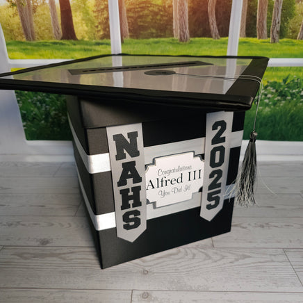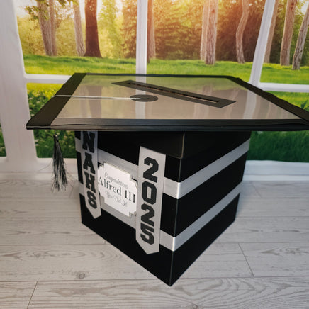 Black and silver graduation cap style card box. Request colors to match your school or party decor and personalize it with your grads' name!