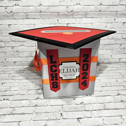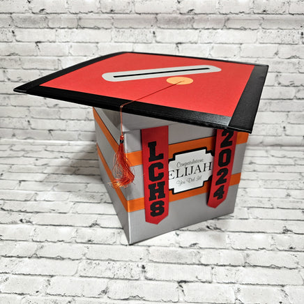Gray, red, orange, and black graduation cap style card box. Request colors to match your school or party decor and personalize it with your grads' name!