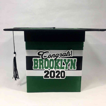Green, black, and white graduation cap style foldable card box with a tassel. Box is great for cards up to 5"x7", money, notes, and other well wishes. The top is made from chipboard and paper and can be used as a guest signing "sheet". Please consider the size of this box and the needs of your party. To avoid mistakes and misunderstandings, please read listing carefully. If something is not clear, please contact me with any questions.