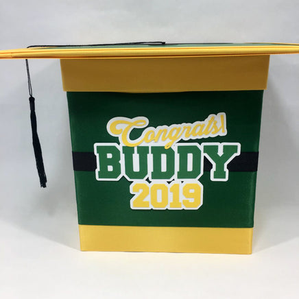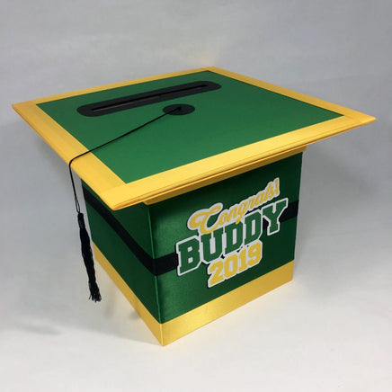 Green, black, and yellow gold graduation cap style foldable card box with a tassel. Box is great for cards up to 5"x7", money, notes, and other well wishes. The top is made from chipboard and paper and can be used as a guest signing "sheet". Please consider the size of this box and the needs of your party. To avoid mistakes and misunderstandings, please read listing carefully. If something is not clear, please contact me with any questions.