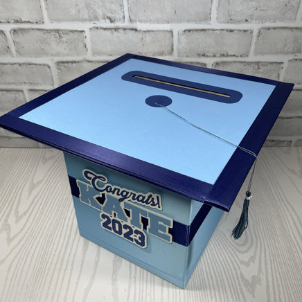 Light blue and navy blue graduation cap style foldable card box with a tassel. Box is great for cards up to 5"x7", money, notes, and other well wishes. The top is made from chipboard and paper and can be used as a guest signing "sheet". Please consider the size of this box and the needs of your party. To avoid mistakes and misunderstandings, please read listing carefully. If something is not clear, please contact me with any questions.