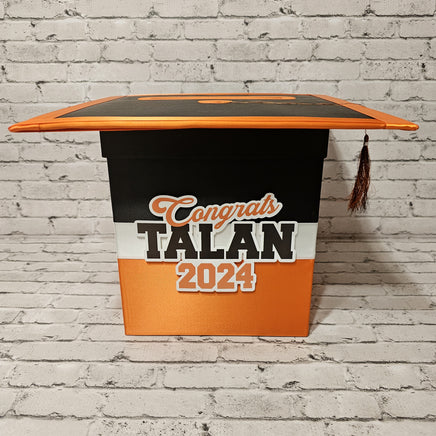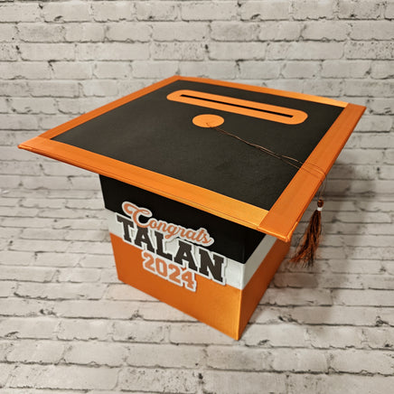 Orange, black, and white graduation cap style foldable card box with a tassel. Box is great for cards up to 5"x7", money, notes, and other well wishes. The top is made from chipboard and paper and can be used as a guest signing "sheet". Please consider the size of this box and the needs of your party. To avoid mistakes and misunderstandings, please read listing carefully. If something is not clear, please contact me with any questions.