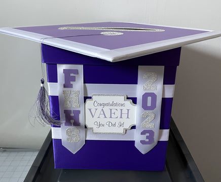 Purple & white graduation cap style card box. Request colors to match your school or party decor and personalize it with your grads' name!