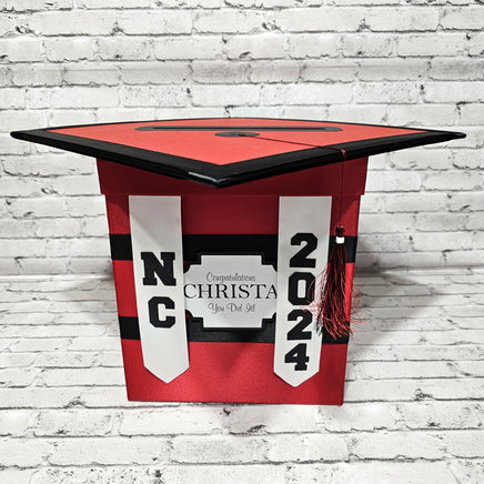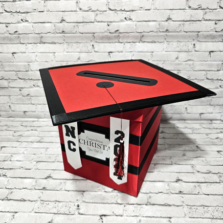 Red, black, and white graduation cap style 6 foldable card box with a tassel. Box is great for cards up to 5"x7", money, notes, and other well wishes. The top is made from chipboard and paper and can be used as a guest signing "sheet". Please consider the size of this box and the needs of your party. To avoid mistakes and misunderstandings, please read listing carefully. If something is not clear, please contact me with any questions.