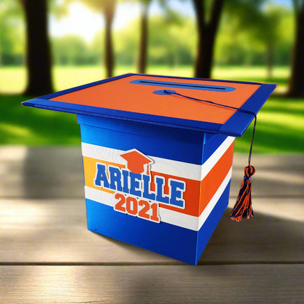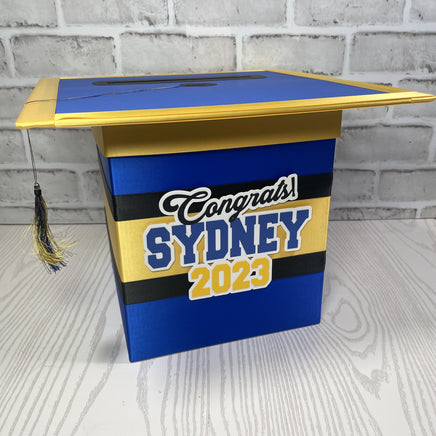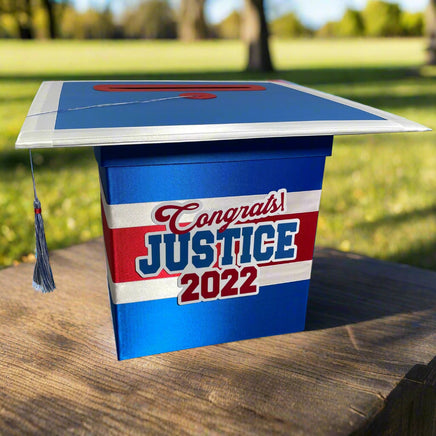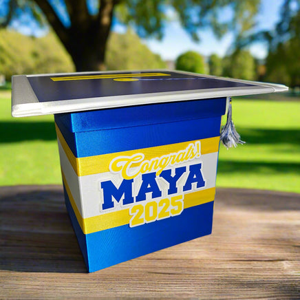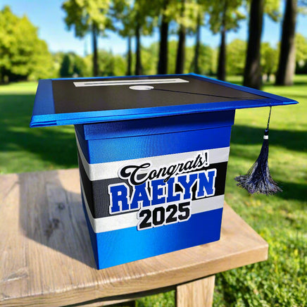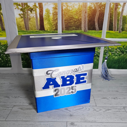 Style 1 graduation card box with royal blue as the prominent color. Many other color combinations available. Please use the charts and guides shown.