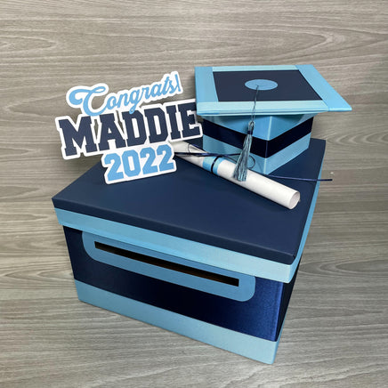 Navy and light blue card box for a graduation party. This box is 10x10x6" with a mini box on top in the style of a graduation cap. It also includes a topper with the name and graduation year of your graduate as well as a mock diploma. The full size is 10x10x9.5". Many colors to choose from to match your school of choice. Please consider the size of this box and the needs of your party. To avoid mistakes and misunderstandings, please read listing carefully. If something is not clear, please contact me with any questions.