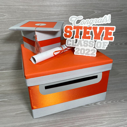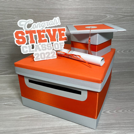 Orange & light gray card box for a graduation party. This box is 10x10x6" with a mini box on top in the style of a graduation cap. It also includes a topper with the name and graduation year of your graduate as well as a mock diploma. The full size is 10x10x9.5". Many colors to choose from to match your school of choice. Please consider the size of this box and the needs of your party. To avoid mistakes and misunderstandings, please read listing carefully. If something is not clear, please contact me with any questions.