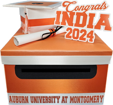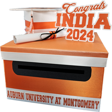 Orange and white card box for a graduation party. This box is 10x10x6" with a mini box on top in the style of a graduation cap. It also includes a topper with the name and graduation year of your graduate as well as a mock diploma. The full size is 10x10x9.5". Many colors to choose from to match your school of choice. Please consider the size of this box and the needs of your party. To avoid mistakes and misunderstandings, please read listing carefully. If something is not clear, please contact me with any questions.