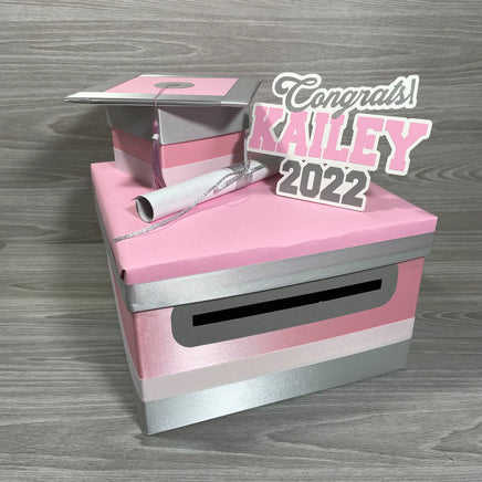 Pink, silver, & white card box for a graduation party. This box is 10x10x6" with a mini box on top in the style of a graduation cap. It also includes a topper with the name and graduation year of your graduate as well as a mock diploma. The full size is 10x10x9.5". Many colors to choose from to match your school of choice. Please consider the size of this box and the needs of your party. To avoid mistakes and misunderstandings, please read listing carefully. If something is not clear, please contact me with any questions.