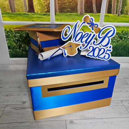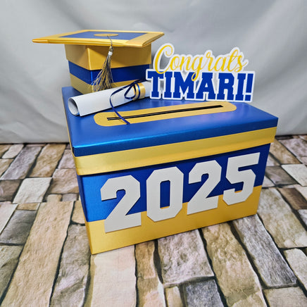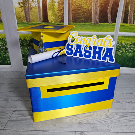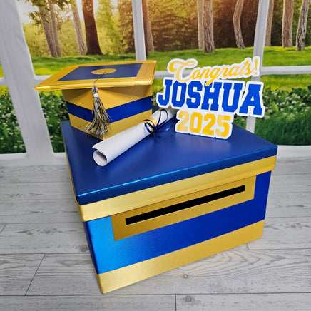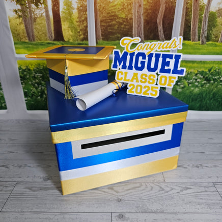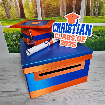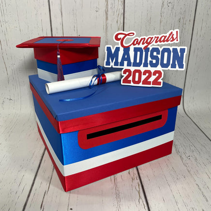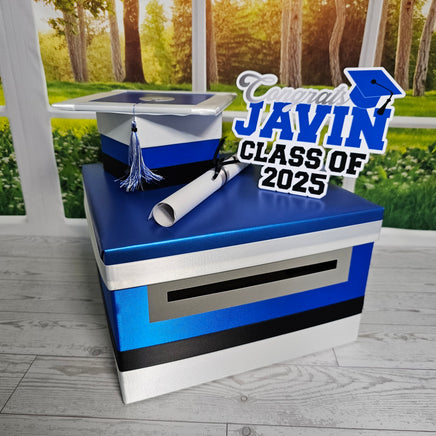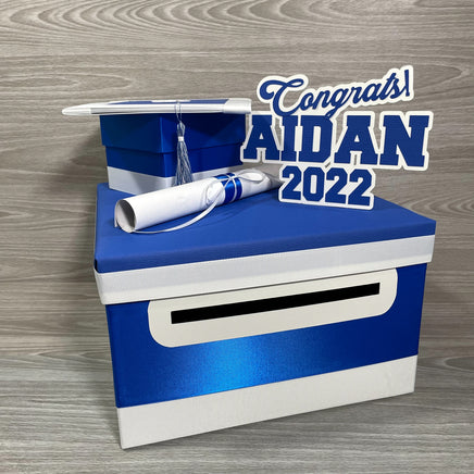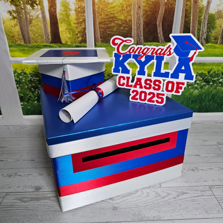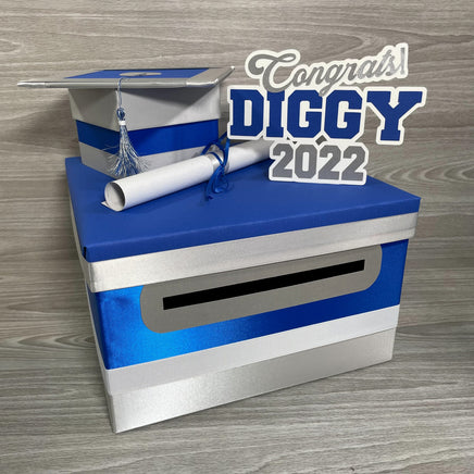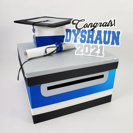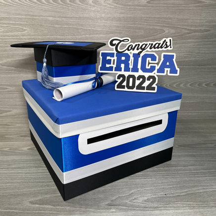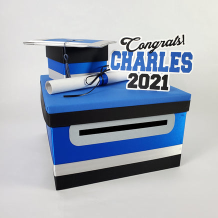 10"x10"x6" graduation card box with royal blue as the prominent color. Many other color combinations available. Please use the charts and guides shown.