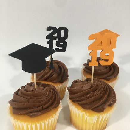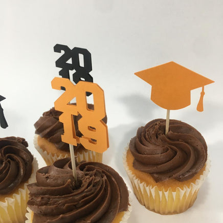 Set of 12 orange and black cupcake toppers for a graduation party or event.