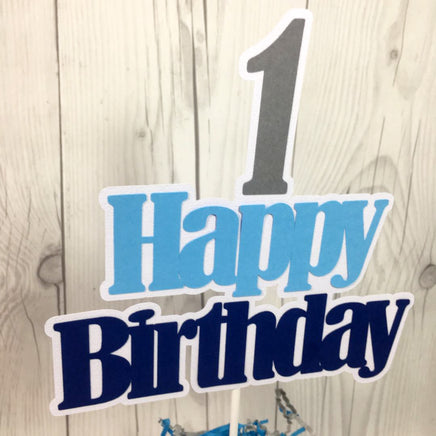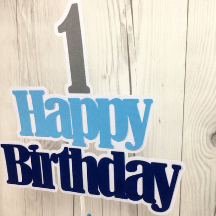 Default topper shows navy, light blue, gray, and white with the number 1 and is made from layered cardstock paper assembled to wooden sticks. The back is solid.