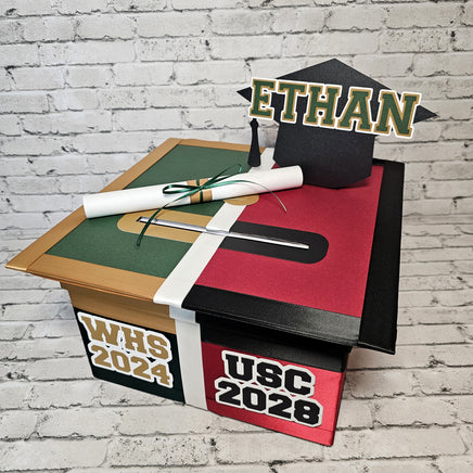 Hunter green, light gold and maroon, black high school to college graduation card box. The high school your graduate is graduating from and the college they're going to.