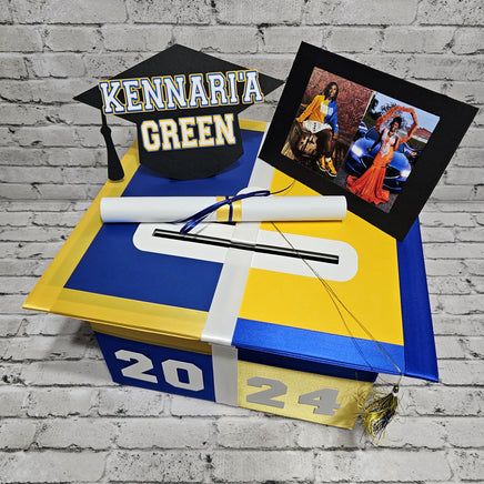 This box features a topper with your tags with the schools' initials and graduating year, graduate's name, a mock diploma, and a picture frame with the graduate's picture (a printed picture is included).