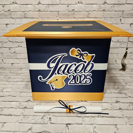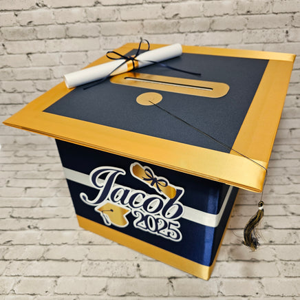 Navy, old gold, and white graduation cap style card box with a tassel. Box is great for cards up to 5.5' x 8.5 ", money, notes, and other well wishes. You can personalize the mock diploma with your graduate's name and, the school, and a short message.