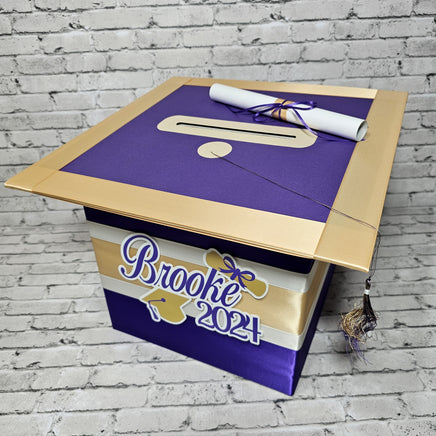 Purple, light gold, and white graduation cap style card box with a tassel. Box is great for cards up to 5.5' x 8.5 ", money, notes, and other well wishes. You can personalize the mock diploma with your graduate's name and, the school, and a short message.