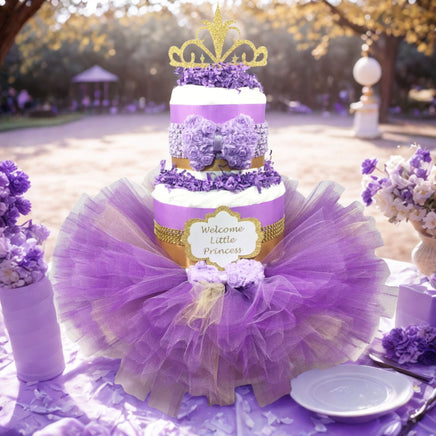 Gorgeous tutu diaper cake will wow all of your guest at your baby shower. Decorated with lavender and gold ribbon with gold-toned rhinestones.