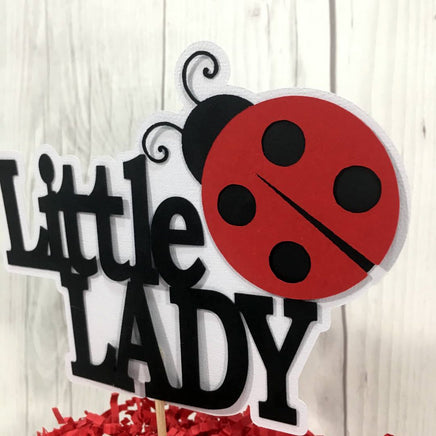 Little Lady ladybug themed cake topper for girl baby showers and birthday parties. Can also be used as a diaper cake topper or centerpiece stick.