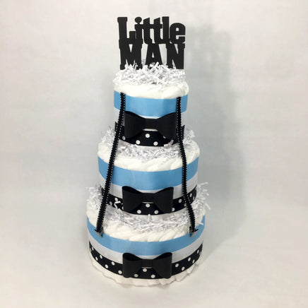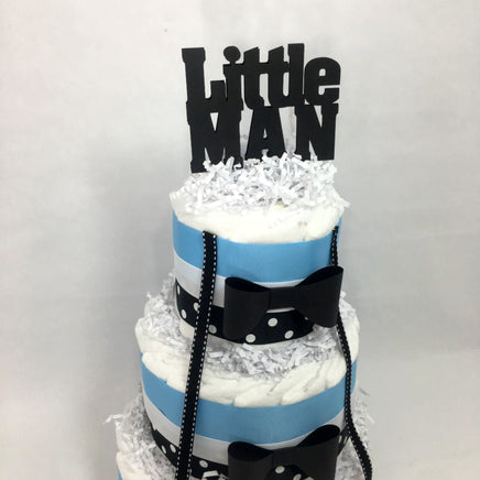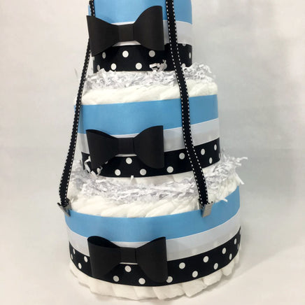 Baby blue, black, and white little man diaper cake centerpiece set for a boy baby shower. Features little suspenders!