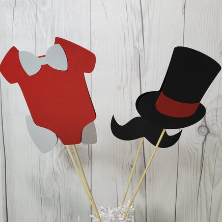 Set of 4 red, gray, and black little man themed centerpiece sticks for a boy baby shower or birthday party.