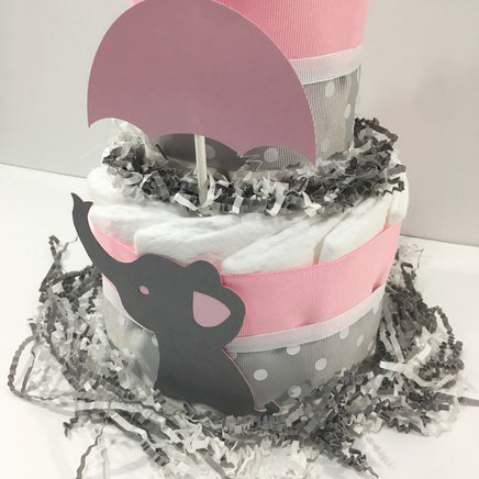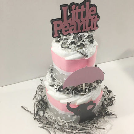 You will also receive a light pink and gray "Little Peanut", topper, a light pink umbrella topper, an elephant cutout (pre-attached to diaper cake), and extra shred to spread around the base of the diaper cake.