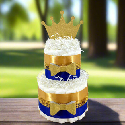 Royal blue and gold 2-tier little prince diaper cake centerpiece for a prince themed baby shower.