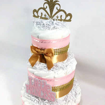 Pink and gold 3-tiered little princess themed diaper cake for a girl baby shower. Princess diaper cake is decorated pink and gold ribbon and gold-toned rhinestone ribbon. There are also 2 satin gold bows, a "Little Princess" sign, and a tiara topper.
