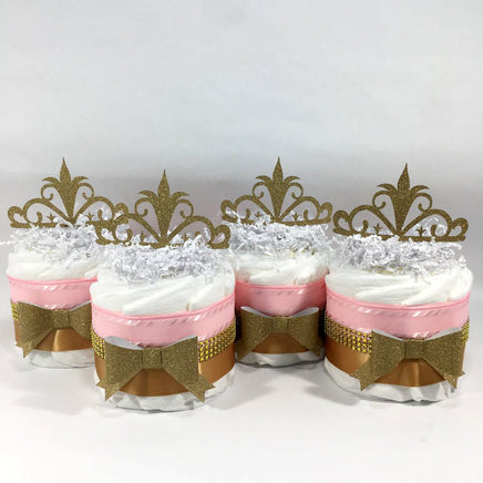 Pink and gold little princess mini diaper cake centerpiece set for a girl baby shower. These princess diaper cakes are decorated with pink and gold ribbon and gold-toned rhinestone ribbon. Each mini cake has a glitter gold bow on the front and a glitter gold tiara topper.