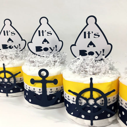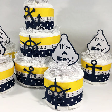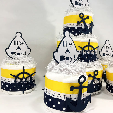 Navy and yellow nautical diaper cake centerpiece set. Perfect for a nautical themed boy baby shower.