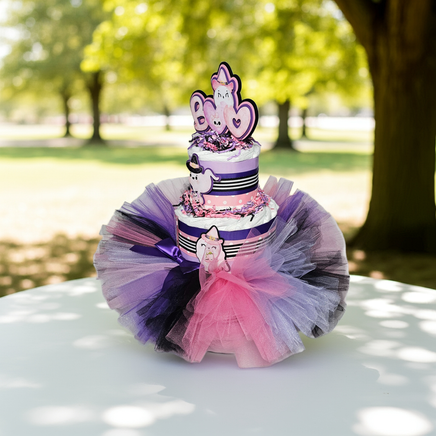 This tutu diaper cake includes 50 size 1 diapers, an infant tutu that baby can wear, and a 3D cake topper. It is about 14" wide with the tutu and 17" tall with the topper.