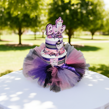 Halloween themed tutu diaper cake centerpiece for a girl baby shower or new baby gift.