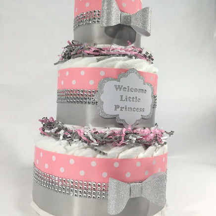 Beautiful 3-tier diaper cake centerpiece for your princess themed baby shower! Color scheme is pink, gray, silver, and white with some silver-toned rhinestones. The default tag is "Welcome Little Princess" but you can request to have something different.