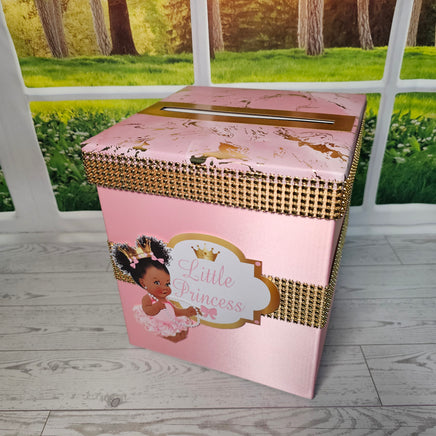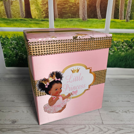 Pink and gold little princess baby shower card box for a girl baby shower.