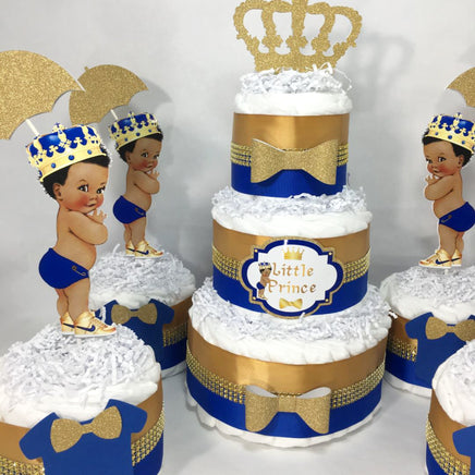 Royal blue, gold, and white prince diaper cake centerpiece set for a boy baby shower. Choose from 4 different baby boy shades as well as if it's for twins.