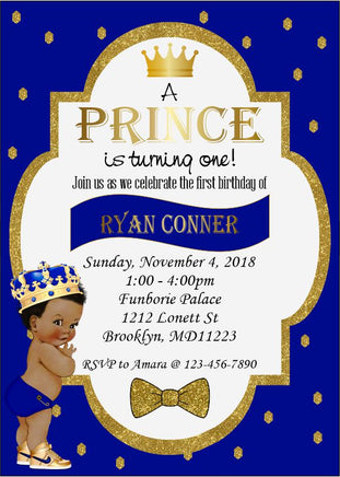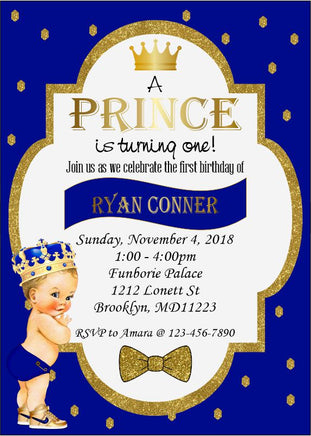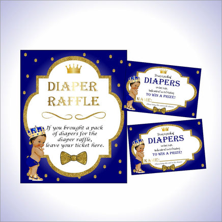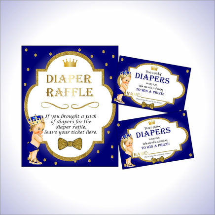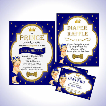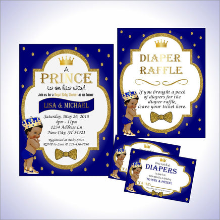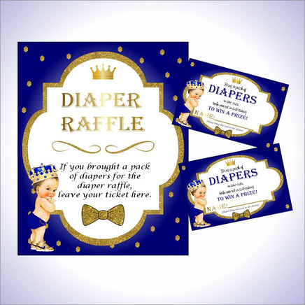 Royal blue and gold little prince themed baby shower invitation with matching diaper raffle sign and diaper raffle tickets. You can print them out or send them digitally.