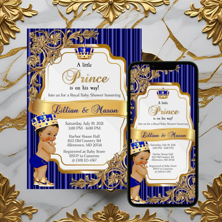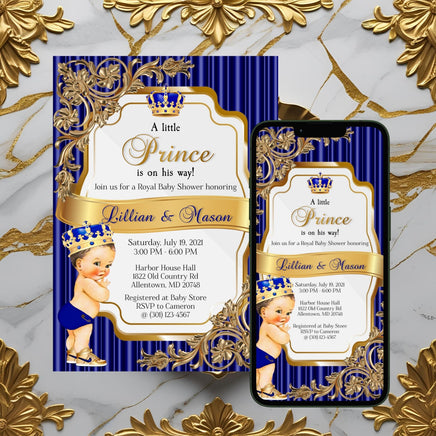 Self editable royal blue and gold digital and printable little prince baby shower bundle.