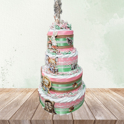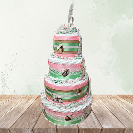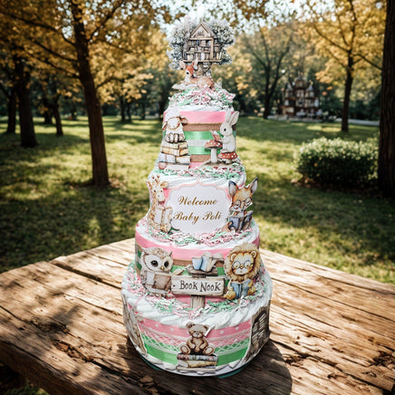 Storybook themed diaper cake centerpiece for a girl baby shower. Diaper cake can be used as a main table centerpiece and gift to the parents-to-be. All the diapers are fully usable. The cutouts can be gently removed and used as decor for baby's room.