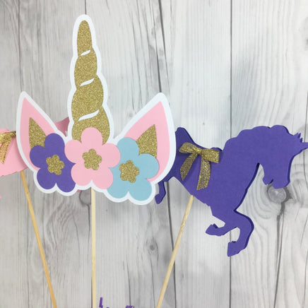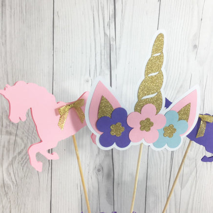 Set of three unicorn centerpiece sticks for a girl baby shower or birthday party.