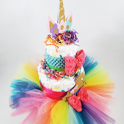 This tutu diaper cake includes 50 size 1 diapers, an infant tutu, and matching infant headband. The unicorn topper is made from cardstock paper.
