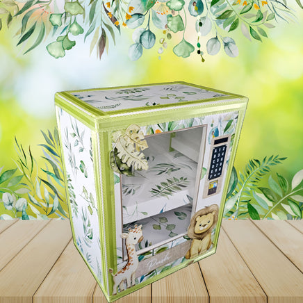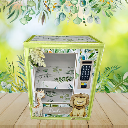 Baby safari themed vending machine style gift box with various uses. You can add special gifts and use this sturdy treasure as a gift box. The receiver can also us the box as a decorative display box or storage box for baby. Request colors to match your party and use it as a table decoration.